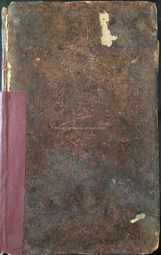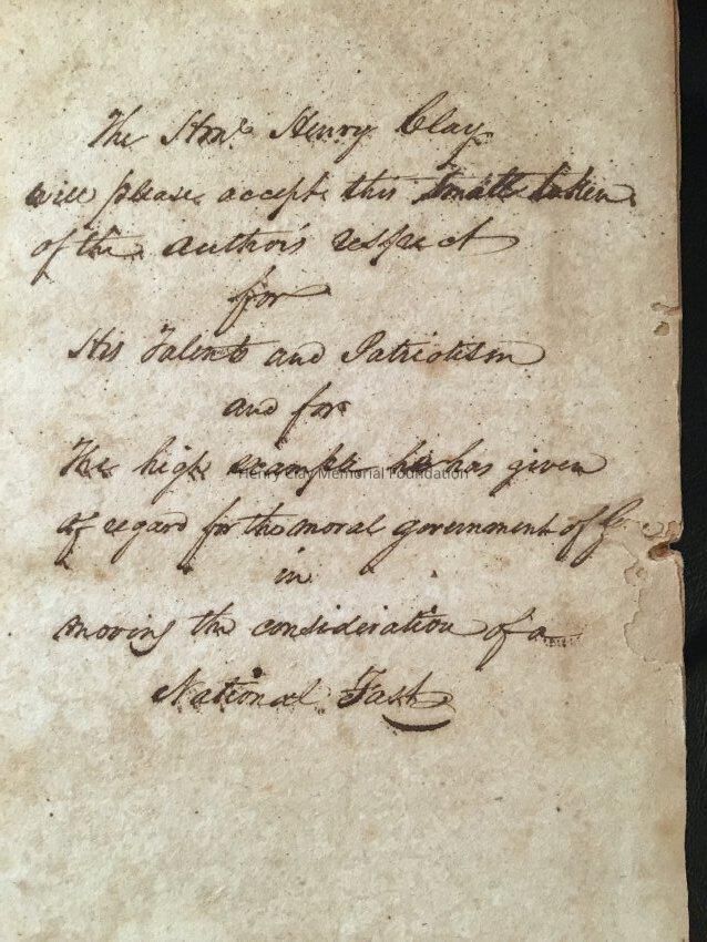 Brown leather bound, gold lettering on red background on spine, 276 pages, inscribed on inside with "The Hon. Henry Clay will please accept this small token of the author's respect for his talent and Patriotism and for the high example he has given of regard for the moral government of... in moving the consideration of a National Fast"
